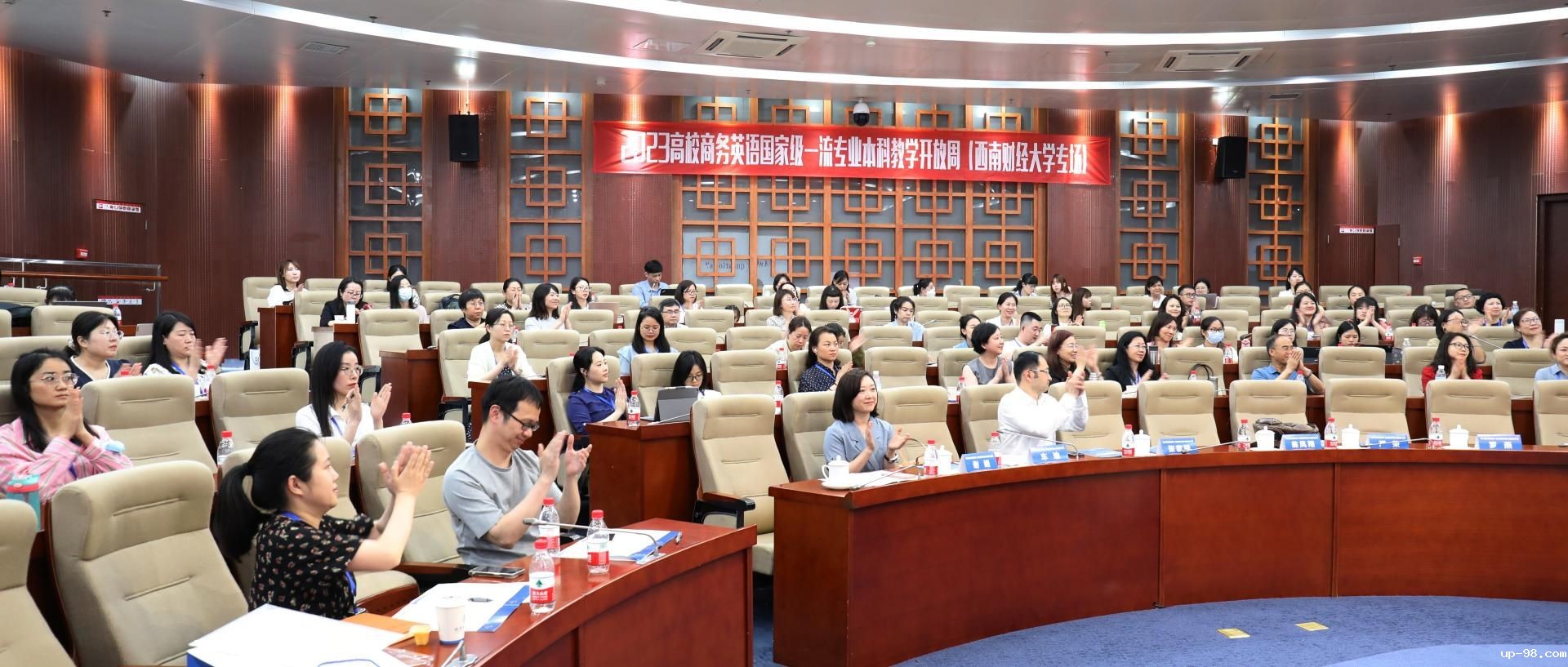 为探寻新时代背景下高校商务英语教学改革创新的路径方法,有效促进优质教育资源的融合共生、优势互补、协同发展,4月19-21日,2023全国高校商务英语国家级一流专业本科教学开放周活动在我校柳林校区举行。活动由中国对外贸易经济合作企业协会商务英语专业工作委员会主办,我校外国语学院承办,来自北京语言大学、上海财经大学、中南财经政法大学、云南财经大学等高校商务英语院系的负责人和专业教师100余人通过公开课、研讨课、专家讲座等多种形式,共谋商务英语一流专业和一流课程建设。学校党委常委、副校长尹庆双教授代表学校致开幕词。