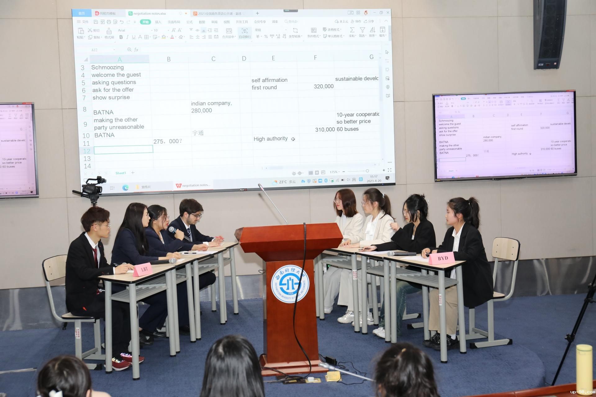 公开课环节,我校外国语学院教师吴瑾以“口译中的视译技巧”为题讲授公开课,从Fast conversion(快速转化)、Sight interpreting(视译)、Simulation in simultaneous mode(同声传译模拟)三个部分,结合党的二十大报告文本,逐一点评近百个口译案例。潘紫萌老师讲授《国际商务谈判》公开课,运用案例式、任务式、启发式教学法,介绍了谈判策略和技巧,学生现场模拟美国LBT和比亚迪的谈判,并对学生的模拟谈判进行现场点评。黄志华老师主讲《商务英语听说》公开课,以中国制造业在新时代取得的瞩目成就为切入口,采用任务式与交际法的教学理念,深入浅出地向学生讲解了华为、联想等中国企业践行人与自然和谐共生的中国式现代化理念的具体实践。