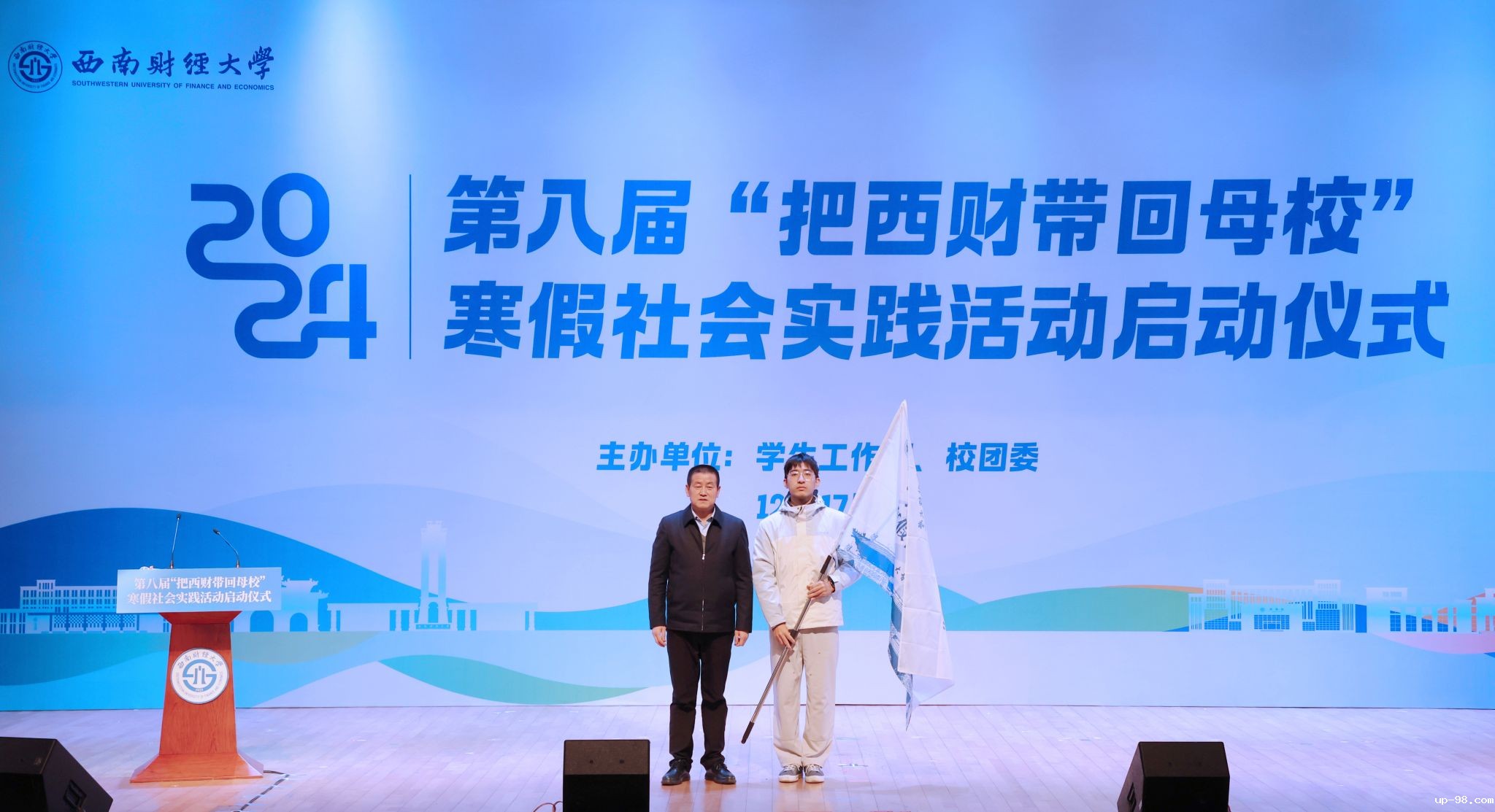 明海峰为第八届“把西财带回母校”寒假社会实践队伍学生代表授旗,并提出殷切期望。他指出,招生宣传是学校面向社会的一扇窗口,是“四环联动”培育时代新人的重要环节,要用智慧去谋划、用责任去担当、用爱心去服务。他强调,各实践队伍要充分展现西财学子自信风貌和卓越风采,在百年校庆历史荣光中满怀自豪感和责任感,在卓越教育深厚积淀中展现学校办学实力和教育魅力,在社会实践广阔舞台上砥砺奋进、知行合一,充分搭建起学校与全国各地生源中学之间的沟通桥梁,为学校招生宣传工作贡献力量。