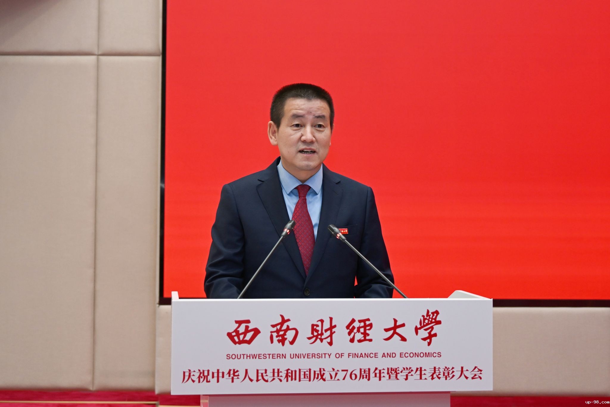 党委书记赵建军代表学校向全校师生员工致以节日问候,向受到表彰的先进学生集体和优秀学生个人表示热烈祝贺。他指出,新中国成立76年来,中国共产党带领全国各族人民同心同德、自立自强,新中国日益走近世界舞台中央、中华民族伟大复兴迎来光明前景。西南财大始终紧跟国家发展战略、紧扣教育发展机遇、紧贴时代发展脉搏,担当奋进,集聚起面向新百年、开启新征程、迈向新起点的坚实底气。