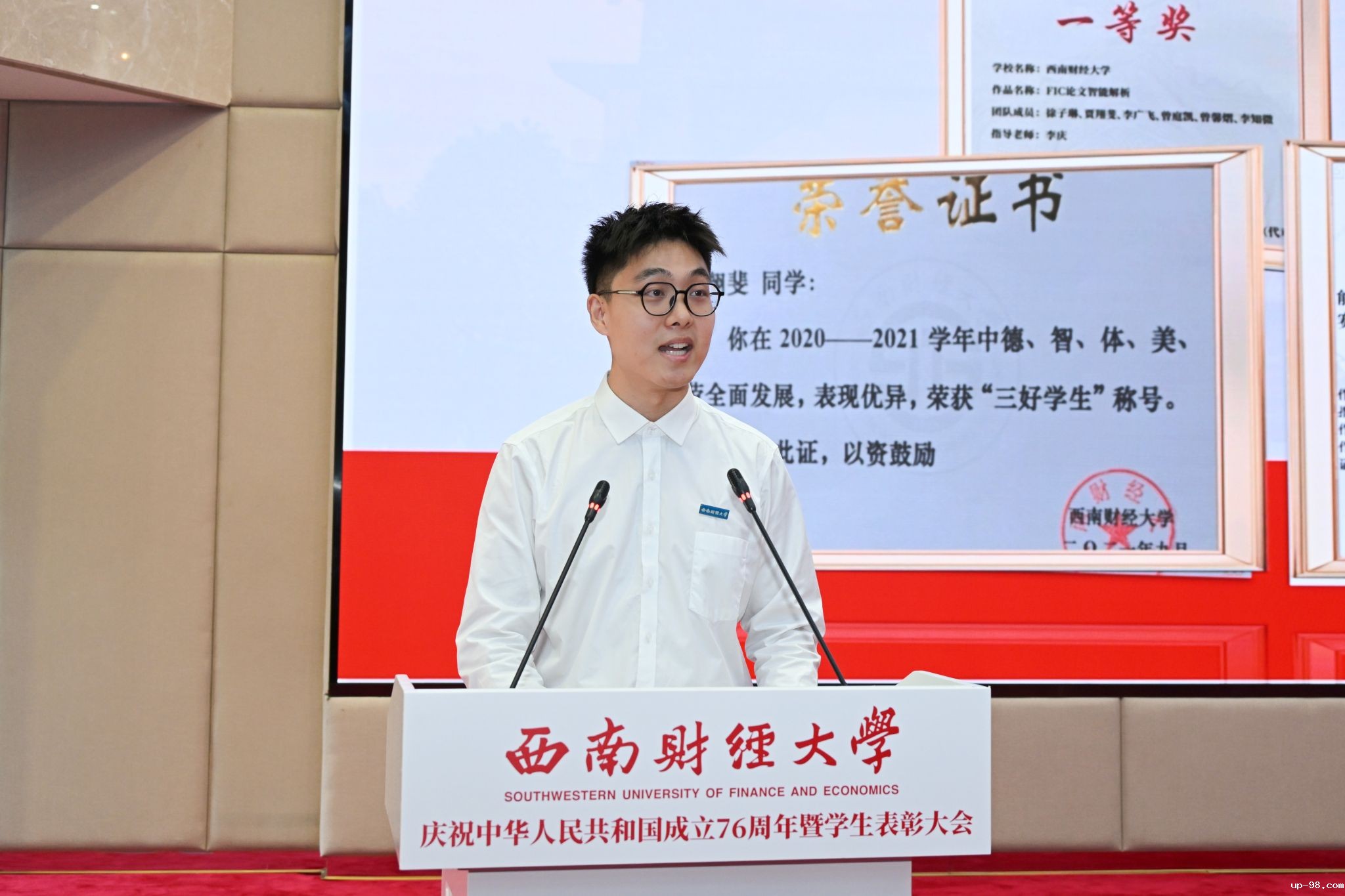 受表彰三好学生代表贾翔斐、优秀学生干部代表杨景茹、先进班集体学生代表叶彦炫结合自身学习生活经历分享交流先进事迹,号召广大西财青年传承“经世济民、孜孜以求”大学精神,把个人理想融入民族复兴的伟大征程,以实际行动为中国式现代化贡献青春力量。