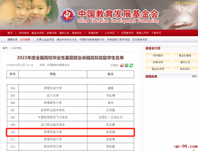 5月26日上午,教育部2023届高校毕业生就业“百日冲刺”行动暨就业促进周启动仪式在京举办。启动仪式上颁发了2022年“全国高校毕业生基层就业卓越奖”,我校校友徐亚雄获评该奖项。奖项由教育部高校学生司、教育部学生服务与素质发展中心共同指导,中国教育发展基金会设立,旨在引导广大高校毕业生到基层逐梦青春、历练成才。徐亚雄是我校工商管理学院2017届硕士研究生,现任乐山市马边彝族自治县荍坝镇党委书记。他积极响应党中央号召,...