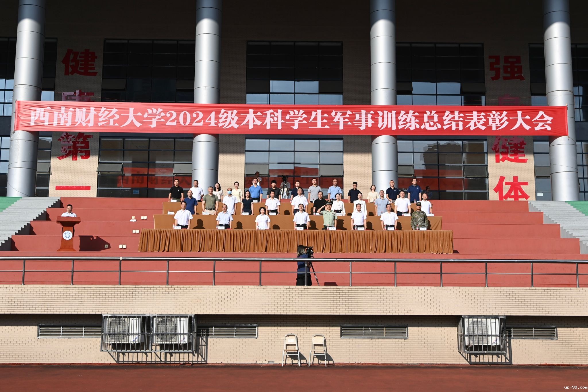 9月22日,学校2024级本科学生军训总结表彰大会在柳林校区晨曦运动场举行。学校党委书记赵建军,党委副书记谢红、明海峰,党委常委、副校长史代敏、李志生、王擎,武警成都支队领导、学校军训工作领导小组成员单位负责人及各本科教学单位相关负责人参加大会。伴随着庄严嘹亮的国歌声,军训总结表彰大会正式拉开帷幕。军训成果展示中,豪迈磅礴的分列式方阵,飒爽矫健的擒敌、战术方队,意气风发的旗语方队,英勇无畏的匕首、刺杀方队,...